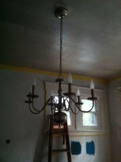 It's just one coat and is for sure needs at least one more coat, but I think it will be a fun, blingy contrast to the peacock walls I'm hoping for. You can see two of the contenders under the window there. Oh, and we had to install the chandelier for the inspector... Obvs it's coming back down before we paint some more.